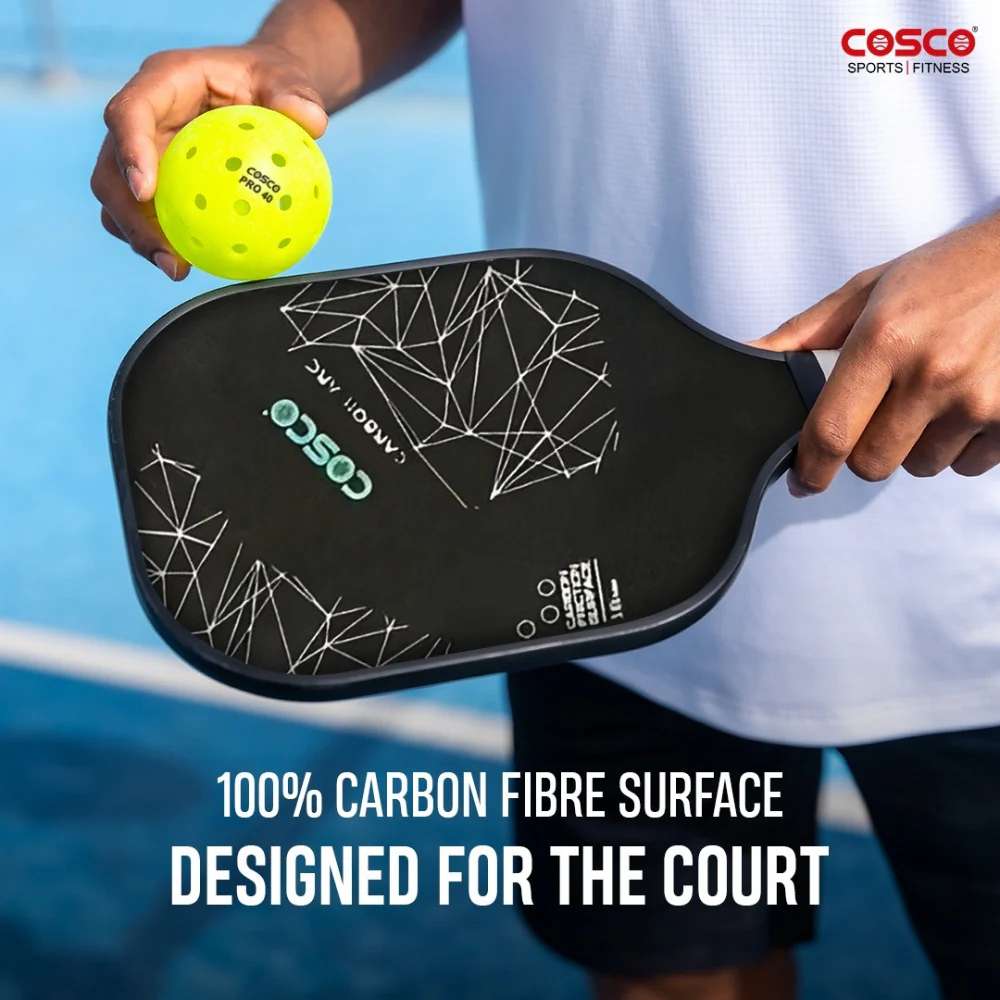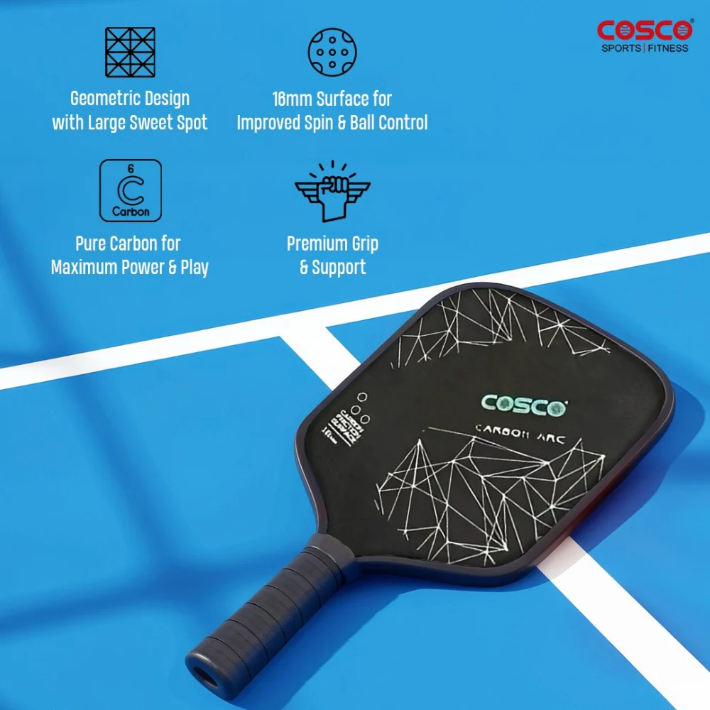 The Cosco Carbon Arc is engineered for players who demand tournament-level performance. Constructed from a 1000 carbon filament weave, it offers a unique blend of flexibility and structural strength. The standout feature is its 16mm Carbon Friction Surface, which provides unparalleled bite on the ball, allowing for extreme spin generation and delicate touch during dinks and drop shots.