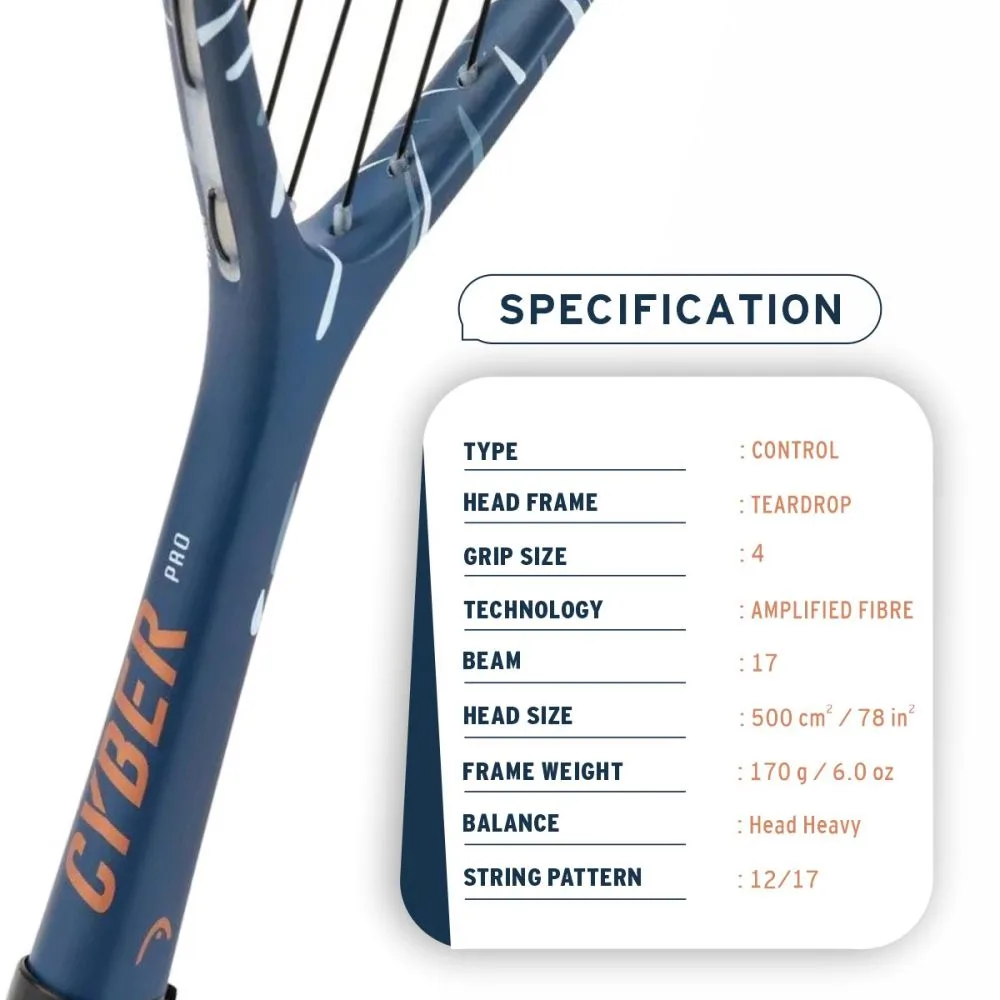 Engineered for recreational and occasional players, the HEAD CYBER PRO Squash Racquet offers an optimal blend of control and power, making it an excellent choice for those seeking a dependable and high-performing frame. Slightly heavier than the TOUR model, the CYBER PRO enhances stability and control with its classic heart-shaped design, ideal for players who value precision without compromising on power. The racquet features HEAD’s proprietary Amplified Fibre Technology (AFT), which strategically increases the stiffness of the frame, delivering improved energy transfer and greater power on every shot. This advanced construction ensures a responsive feel, helping players generate depth and pace with minimal effort.
