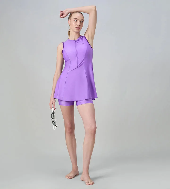 The Endurabrite Swimdress features a sophisticated frock-style silhouette paired with integrated bootleg shorts for maximum security and ease of movement. Whether you’re logging laps, attending an aqua aerobics class, or lounging poolside, this suit offers a streamlined fit that celebrates your shape without compromising on modesty.