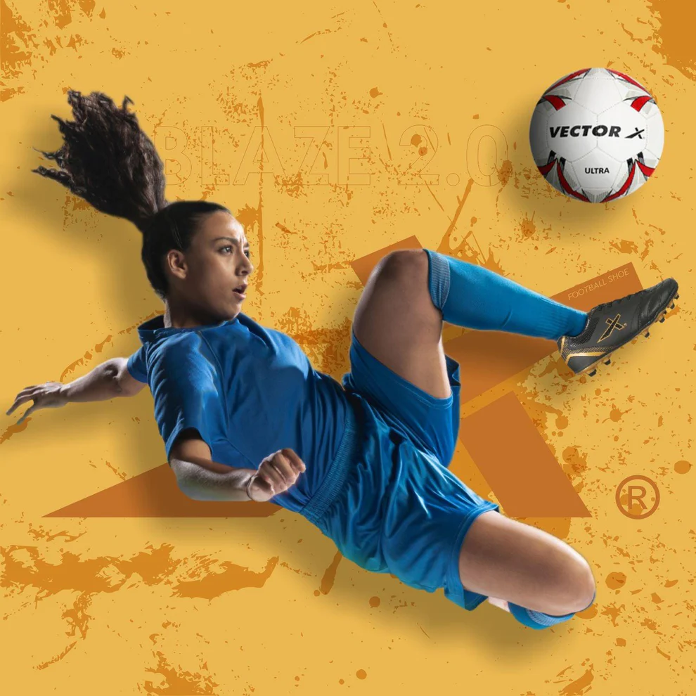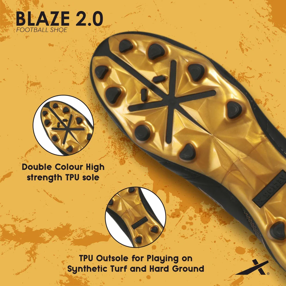 The Vector X Blaze-2.0 Football Shoes are engineered for agility and speed, making them a standout choice for both novice and intermediate players. These cleats combine a lightweight build with a striking black and gold aesthetic to help you dominate the pitch in style.